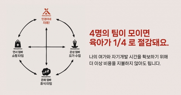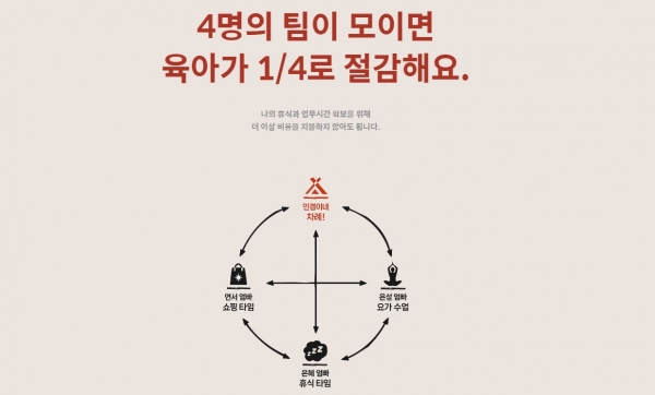 '육아를 1/N 하라'는 슬로건 아래 아이와 부모의 성향을 데이터로 분석해 맞춤형 육아 팀플레이를 함께할 수 있는 부족을 매칭한다. 이처럼 품앗이 육아와 다양한 정보 교류가 가능한 커뮤니티 기능을 제공하는 점이 특징이다.