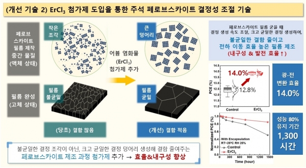 10월 논문에서는 2월 논문 기술과 함께 페로브스카이트 필름층에 ‘어븀 염화물(ErCl3)’도 첨가했다. 첨가제는 주석이 산화되는 것을 방지하는 역할과 함께 액체 상태의 페로브스카이트가 필름으로 굳을 때 균일하고 큰 결정 생성을 통해 결함을 줄이고 전자 이동을 도와줬다.