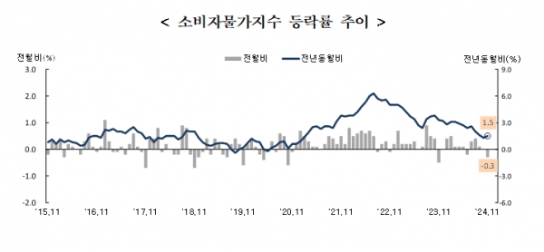 [인더스트리뉴스 김은경 기자] 통계청이 3일 발표한 소비자물가 동향에 따르면 11월 소비자물가 지수는 114.40(2020년=100)로 작년 같은 달보다 1.5% 상승했다.
