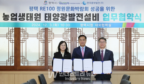 [인더스트리뉴스 정한교 기자] 평택시(시장 정장선)는 지난 3일 평택시청 대외협력실에서 경기환경에너지진흥원(원장 김혜애), 한국중부발전(사장 이영조)과 함께 ‘평택 RE100 정원문화박람회 성공을 위한 농업생태원 태양광 발전설비 업무협약’을 체결했다고 밝혔다.
