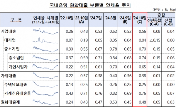10월 말 기업 대출 연체율은 0.56%로 전월말(0.52%) 대비 0.04%p 상승했다.