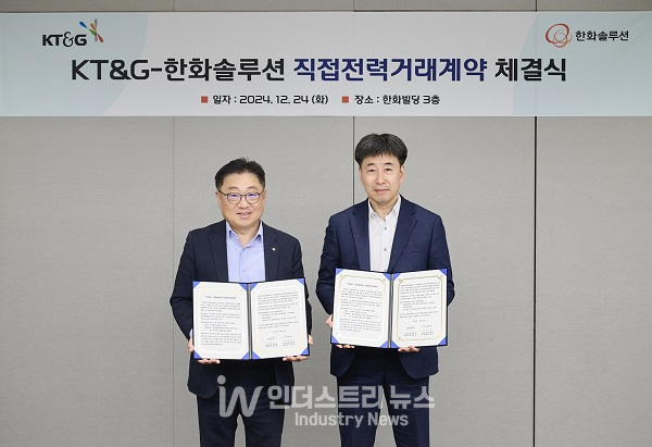 [인더스트리뉴스 정한교 기자] KT&G(사장 방경만)가 ‘2045년 탄소중립 목표 달성’을 위해 한화솔루션 큐셀부문과 ‘재생에너지 직접전력구매계약(Power Purchase Agreement, PPA)’을 지난 24일 체결했다고 밝혔다.