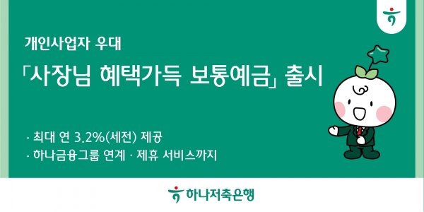 [인더스트리뉴스 김은경 기자] 하나저축은행(대표 정민식)은 31일 경기 침체로 어려움을 겪는 소상공인과의 상생금융 실천을 위해 '사장님 혜택 가득 보통예금' 상품을 출시했다고 밝혔다.