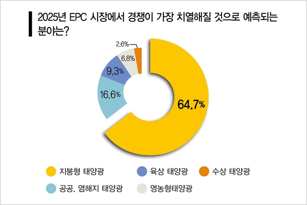 <2025년 EPC 시장에서 경쟁이 가장 치열해질 것으로 예측되는 분야>를 묻는 항목에서는 ‘지붕형 태양광’이 64.7%로 압도적인 선택을 받았다. 설문에 참여한 한 업계 관계자는 “최근 할 수 있는 태양광 사업은 지붕형 태양광밖에 없다”고 주관 답변을 달기도 했다. 뒤를 이어 ‘공공, 염해지 태양광’이 16.6%의 응답을 받았고, △육상 태양광(9.3%) △영농형태양광(6.8%) △수상 태양광(2.6%) 순으로 응답이 이뤄졌다.