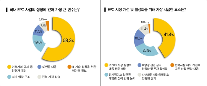 이러한 업계 상황은 이어진 설문 항목인 <국내 EPC 사업의 성장에 있어 가장 큰 변수>에 대한 질문에서도 비슷한 양상으로 나타났다. ‘이격거리 규제 등 인허가 개선’ 58.3%로 절반 이상의 응답을 받았으며, △저가 입찰 구조(19.6%) △KS인증 대응(11.5%) △전력 가격 상승(7.4%) △IT 기술 접목을 위한 데이터 확보(3.2%)가 그 뒤를 이었다.