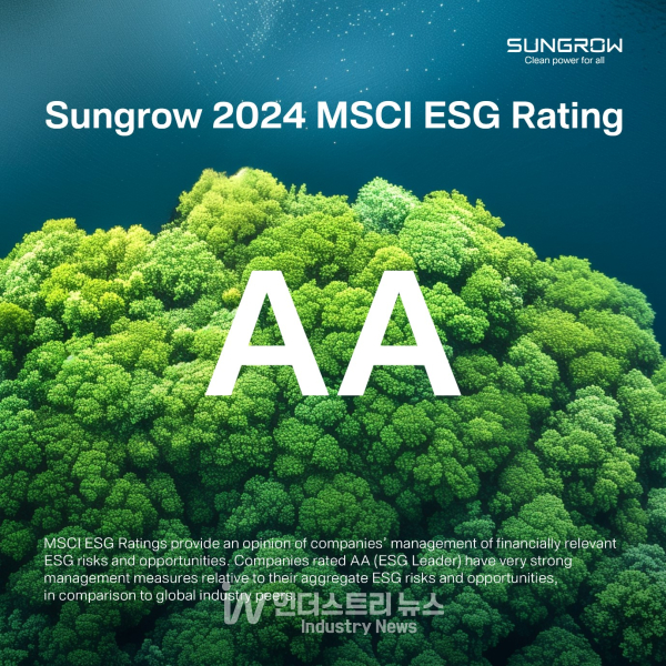 [인더스트리뉴스 정한교 기자] 글로벌 에너지 솔루션 기업 선그로우(Sungrow)가 2024년 MSCI(Morgan Stanley Capital International)에서 발표한 ESG 평가에서 AA 등급을 획득했다고 24일 밝혔다.