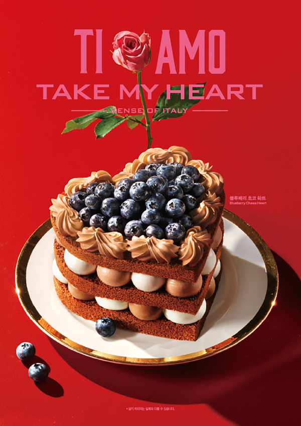 파스쿠찌는 '티아모 테이크 마이 하트'를 콘셉트로 하트 모양을 활용한 케이크로 선보였다. '티아모(Ti amo)'는 이탈리아어로 '당신을 사랑한다'를 뜻한다.