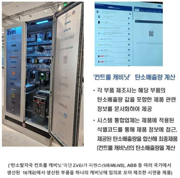 ‘탄소발자국 컨트롤 캐비닛’이란 ZVEI가 지멘스(SIEMENS), ABB 등 16개사에서 생산된 부품을 하나의 캐비닛에 Embedded해 넣어놓고, 캐비닛 문을 닫아 하나의 완성품 QR코드를 생성한다.