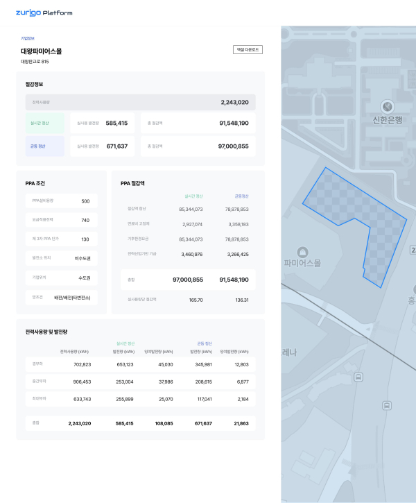 위제이의 PPA 플랫폼 ‘zurigo’는 기업과 발전소의 위치나 PPA 조건에 따라 최적의 매칭을 제공한다. 간단한 기본정보만 입력하면, PPA 도입효과에 대한 분석 내용을 5분 만에 보고서로 제공하는 오픈형 분석서비스이다. 그리고 기업의 실시간 전력사용량부터 재생에너지 PPA에 대한 모든 데이터를 관제하는 모니터링 시스템까지 제공한다.