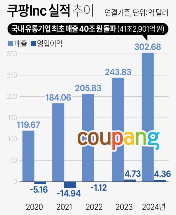 [인더스트리뉴스 서영길 기자] 쿠팡Inc가 사상 처음으로 연 매출 40조원을 넘어서며 2년 연속 영업 흑자를 이어갔다.