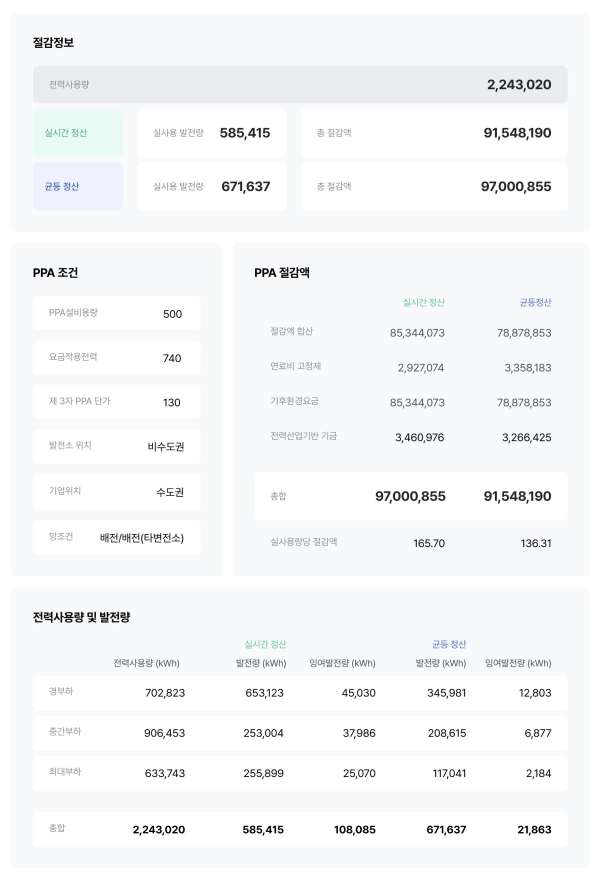 또한, 온사이트 PPA와 오프사이트 PPA 도입에 따른 발전량 대비 PPA 발전량, 잉여발전량, 실구매발전량, PPA 구매비용 및 PPA 망이용료 등 부대비용, PPA 도입에 따른 실수익을 하나의 계정에서 통합적으로 관리할 수 있도록 했다.