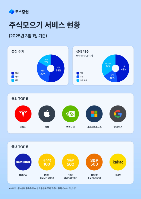 토스증권 관계자는 "주식모으기는 토스증권 고객 2명 중 1명이 이용하는 서비스로, 초보 투자자부터 경험이 많은 투자자까지 다양한 사용자를 아우르는 투자 방식으로 자리 잡고 있다"고 말했다.