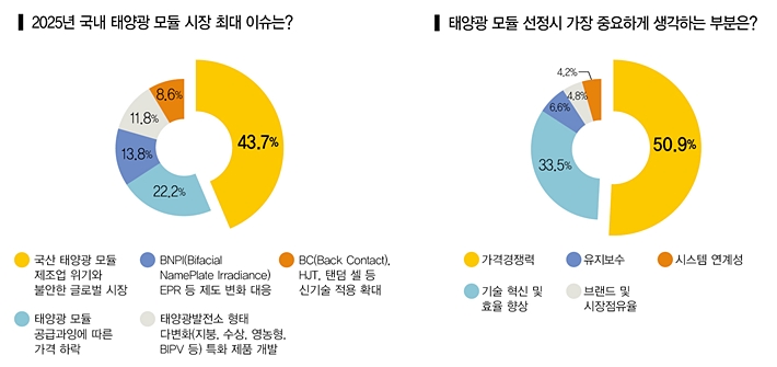 <2025년 국내 태양광 모듈 시장 최대 이슈>를 묻는 항목에서는 ‘국산 태양광 모듈 제조업 위기와 불안한 글로벌 시장’이 43.7%로 가장 많은 답변을 이끌었다. 이와 관련해 주관식 답변에서 의견을 보탠 한 응답자는 “국산 태양과 모듈 제조업계가 심각한 위기에 직면한 상황에서 국가 간 전쟁이나 미국 권력 변화 등은 더 큰 위기상황을 우려케 한다”며, “이러한 때 일수록 정부가 적극적으로 국내 시장과 제조기업들을 생존시킬 수 있는 동반자적 자세가 필요하다”고 조언했다.