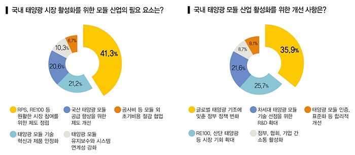 <국내 태양광 모듈 산업 활성화를 위한 개선 사항>에 대한 질문에는 ‘글로벌 태양광 기조에 맞춘 정부 정책 변화’가 35.9%로 가장 많은 응답을 받았으며, 뒤를 이어 △RE100, 산단 태양광 등 시장 기회 확대(25.7%) △차세대 태양광 모듈 기술 선점을 위한 R&D 확대(21.6%) △정부, 협회, 기업 간 소통 활성화(8.7%) △태양광 모듈 인증, 표준화 등 합리적 개선(8.1%) 순으로 결과가 나왔다.