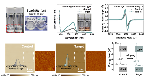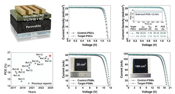 에틸렌 카보네이트로 만든 전지는 25.56%의 광전변환 효율(PCE)을 기록했다. 이는 tBP를 쓰지 않는 전지 중에서 세계 최고 수준의 효율이다.