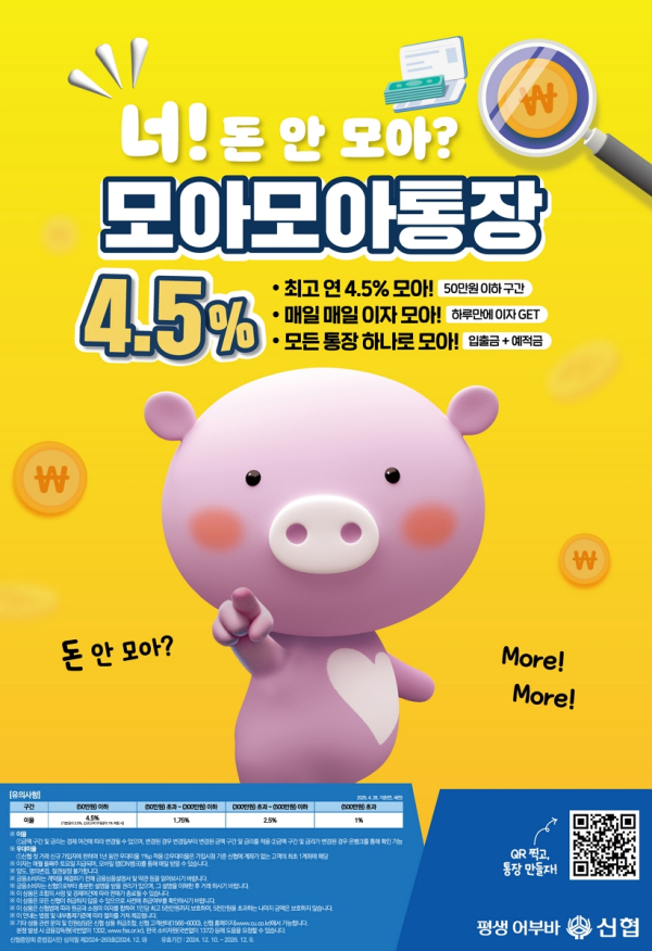 조용록 신협중앙회 금융지원본부장은 "모아모아통장에는 젊은 세대의 생활 방식에 맞춰 실용성과 재미, 혜택을 모두 담고자 했다"며 “앞으로도 신협은 포용금융을 실현하는 생활 밀착형 금융상품을 지속적으로 선보이겠다”고 말했다.