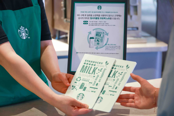 스타벅스는 이벤트 기간 동안 전국 매장에서 MD 상품 구매 후 일회용 쇼핑백을 구매하지 않는 고객을 대상으로 '우유팩 업사이클링 노트'를 매장별 선착순 20명에게 증정한다.