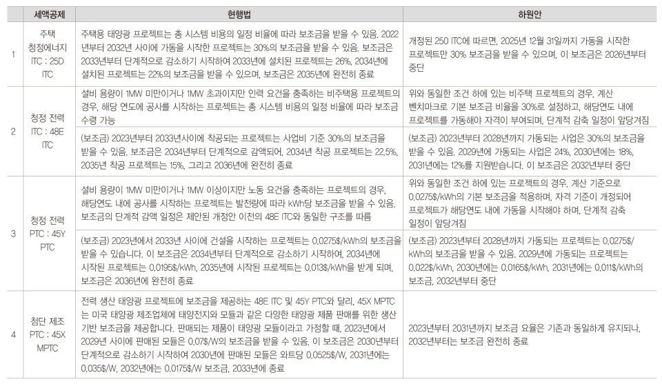주택용 태양광 및 ESS 부문의 경우, 투자세액공제(ITC) 만료일을 2025년 12월 31일로 제안해 미국 주택 시장에 충격을 주고 있다. 현행법에서 투자세액공제는 2032년 12월 31일까지 투자의 30%를 보장하다가 2033년 26%, 2034년 22%로 단계적으로 감소할 예정이다. 우드맥킨지(Wood Mackenzie)는 세액공제 종료 가속화로 인해 미국 태양광 제조업체의 자금조달 경로가 심각하게 방해를 받을 수 있다고 우려하고 있다.