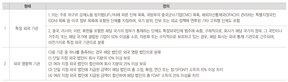 금지된 외국 기관에 대한 엄격한 규정도 정의하고 있다. 특정 외국 기관(specified foreign entity) 및 외국 영향력 기관(foreign-influence entity)으로 구분하는데, 비미국 제조업체가 어느 한 범주에 속하게 되면 48E, 45Y, 45X에 따른 세액공제와 같은 주요 보조금을 전혀 받을 수 없게 된다. 이는 해외 제조업체의 미국 시장 전략 및 투자 계획에 중대한 영향을 미칠 전망이다.