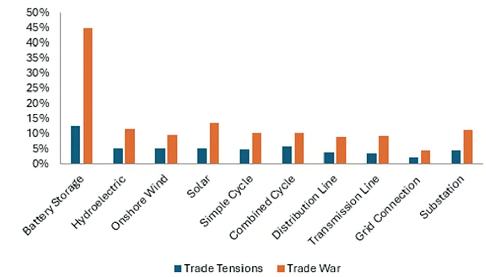 후자인 관세 전쟁 시나리오는 트럼프 대통령이 공격적인 관세 정책을 유지하고 2030년까지 글로벌 실효 관세율이 30%가 되도록 상호관세를 부과하는 것이다. 미국 관세로 인한 불확실성은 프로젝트 개발 활동을 둔화시킬 가능성이 높으며, 이로 인해 잠재적인 지연과 전력구매계약(PPA)의 가격 상승을 초래할 것이다. 중국 수입에 대한 의존도가 높은 유틸리티 규모 ESS 프로젝트의 경우, 12~50% 이상 가장 큰 폭으로 비용 증가가 예상된다. 트럼프 행정부의 세액공제는 없애고 징벌적 관세 폭탄을 날려 미국 내 투자를 활성화하겠다는 전략으로 인해 미국 태양광 시장의 분위기는 불과 6개월 만에 급반전했다. 해외 기업들의 매력적인 투자처가 될 수 있도록 과연 미국 경기와 수요는 살아날 수 있을까?