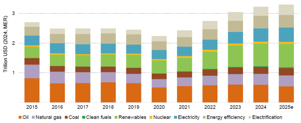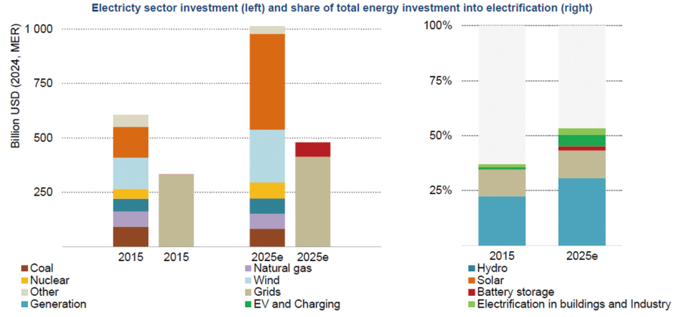 전기 시대의 도래와 산업, 냉방, 전기차(EV), 데이터 센터, 인공지능(AI) 분야의 전력수요 급증에 따라 투자가 형성되고 있다. 발전 부문 투자는 2025년에 1.5조 달러에 도달할 것으로 예상되는데, 처음으로 청정전력 투자가 석유, 천연가스, 석탄 등 화석연료 투자를 앞지를 것으로 기대된다.