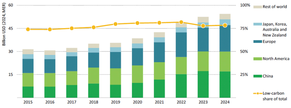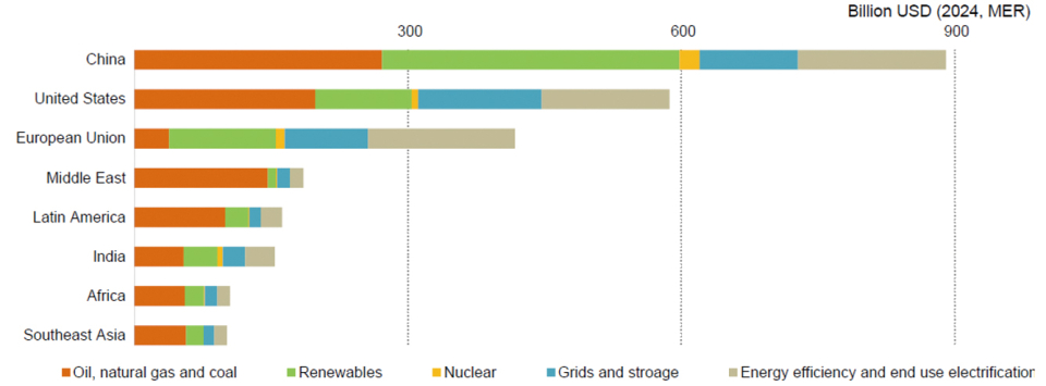 투자 증가의 20%는 미국에서 발생했는데, 탄소중립 기술 공급망에서 중국의 입지를 위협하려는 욕구에서 비롯되었다. 2025년에도 중국은 세계 최대 에너지 투자국으로, EU의 2배이자 EU와 미국을 합친 금액과 동등한 규모를 자랑할 것으로 전망된다. 글로벌 청정에너지 투자에서 중국이 차지하는 비중은 10년 전 1/4에서 현재 1/3로 증가했다.