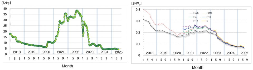 2025년 6월 18일 기준으로 태양광 폴리실리콘 평균가격이 4.25$/kg를 기록하면서 2025년 3월 26일 기록했던 5.01$/kg 대비 15% 감소했다. 6월 1일 발효된 중국 시장의 정책 변화 이전 설치 증가 모멘텀으로 3월에 보여주었던 일시적인 반등 시그널을 2분기에 모두 반납하며 다시 바닥을 보여주고 있다.