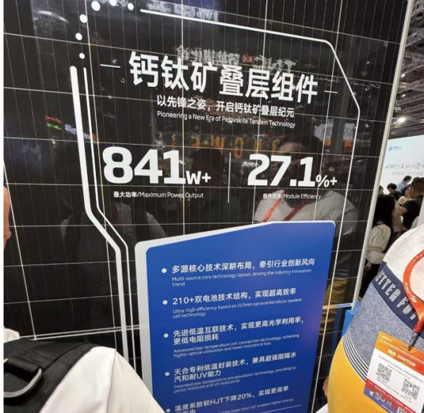 2단자 상용면적(3.1m2) 탠덤 모듈 효율도 계속 갱신하고 있는데, 2025년 3월에 달성한 초기효율 26.1% (808W)를 시작으로 6월에 26.7% (829W) 및 27.1% (841W)를 연이어 발표했다. 효율 검증은 TÜV SÜD에서 수행했다고 주장한다. 효율 향상의 비결은 저온 상호연결과 자외선과 수분에 저항성이 강한 저온 봉지 기술 적용에 있다고 간단하게 공개했고, 특징으로는 온도계수가 HJT 모듈보다 20% 개선됐다고 하는데, –0.19%/oC 수준으로 추정된다.