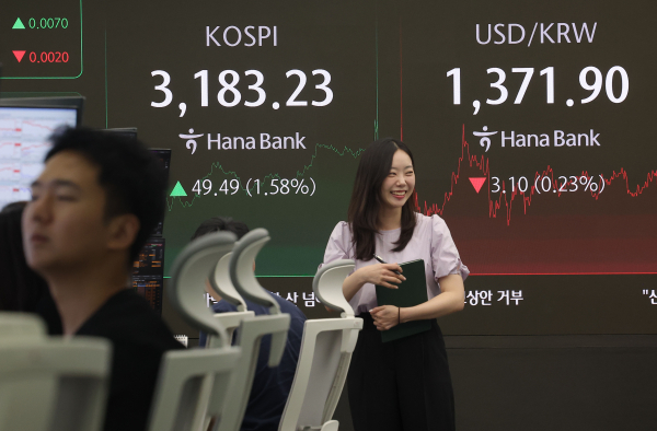 10일 한국거래소에 따르면 이날 코스피는 전 거래일 대비 49.49포인트(1.58%) 오른 3183.23으로 장을 마감하면서 종가기준 지난 2021년 9월7일(3187.42) 이후 가장 높은 수준을 기록했다.