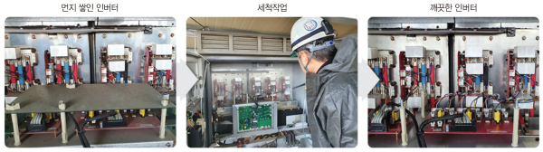 앞서 소개한 ‘톰스’를 통한 실시간 모니터링 및 관제뿐만 아니라 정기적인 현장 점검을 진행하고 있다. 현장 점검에서도 한국에너지서비스만의 특화 기술력을 접목했다. 전문 세정제를 활용해 모듈의 발전 효율 저하를 방지(SPC-10 세척제)하고, 인버터의 성능 유지 및 수명을 연장(BTS-77 세정제)한다. 이와 함께 모듈의 발전 효율 극대화를 위해 세정제에 청소로봇을 결합했다. 이를 통해 발전 효율을 평균 7~15% 향상시킬 수 있다.