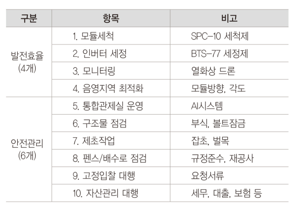 현장 점검에서는 모듈/인버터 세척, 배선/구조물 점검, 제초 작업, 음영 진단 등의 전 과정을 수행할 뿐만 아니라 드론, 열화상 카메라 등을 활용해 고정밀 점검도 진행한다. 또한, 발전사업자 요청 시 입찰 대행 업무 지원, 발전소 운영과 관련된 자산 관리 업무도 지원하며 발전소 운영 전반을 아우르는 서비스를 제공하고 있다.