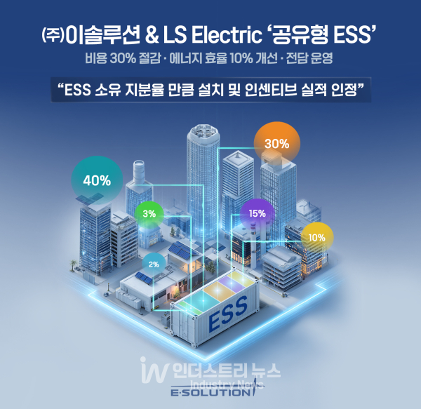 [인더스트리뉴스 정한교 기자] 이솔루션(구 인지이솔루션)은 경기도와 고양특례시가 주도하고, 한국전력공사와 LS일렉트릭(LS ELECTRIC)이 참여하는 ‘공유형 에너지저장장치(ESS) 실증사업’에 ESS 배터리 시스템을 공급한다고 16일 밝혔다.