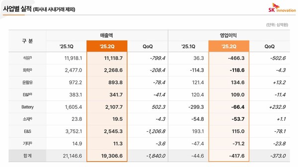 2분기 실적을 각 사업별로 보면 ▲석유사업 매출 11조1187억원, 영업손실 4663억원 ▲화학사업 매출 2조2686억원, 영업손실 1186억원 ▲윤활유사업 매출 8938억원, 영업이익 1346억원 ▲석유개발사업 매출 3417억원, 영업이익 1090억원 ▲배터리사업 매출 2조1077억원, 영업손실 664억원 ▲소재사업 매출 195억원, 영업손실 537억원 ▲SK이노베이션 E&S 사업 매출 2조5453억원, 영업이익 1150억원을 각각 기록했다.