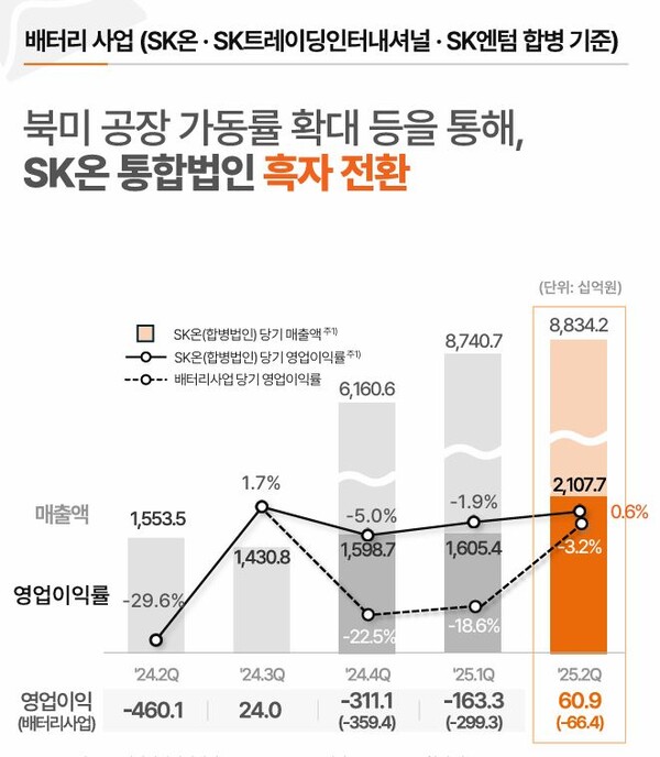 배터리사업 매출은 2조1077억원으로, 미국과 유럽 공장 가동률 개선 및 판매량 증대에 힘입어 전 분기보다 31% 증가했다. 영업이익이 전 분기 대비 2330억원 개선된 -664억원을 기록했으며, SK온 통합 법인으로는 합병 이후 첫 분기 흑자 609억원을 달성했다.