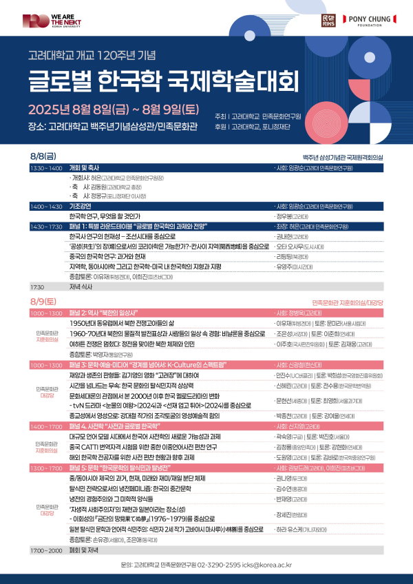 [인더스트리뉴스 서영길 기자] 고려대학교(총장 김동원) 민족문화연구원(원장 허은)은 오는 8일부터 9일까지 ‘글로벌 한국학 국제학술대회’를 개최한다고 1일 밝혔다.