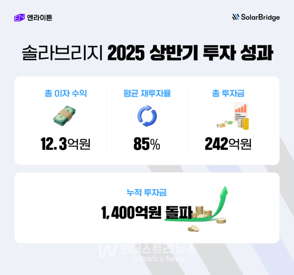 [인더스트리뉴스 정한교 기자] 재생에너지 전문 투자 플랫폼 솔라브리지(대표 김태호)가 2025년 상반기 투자 성과를 공개하며, 플랫폼을 통한 실질적인 수익 달성과 안정적 구조를 입증했다고 지난 1일 밝혔다.