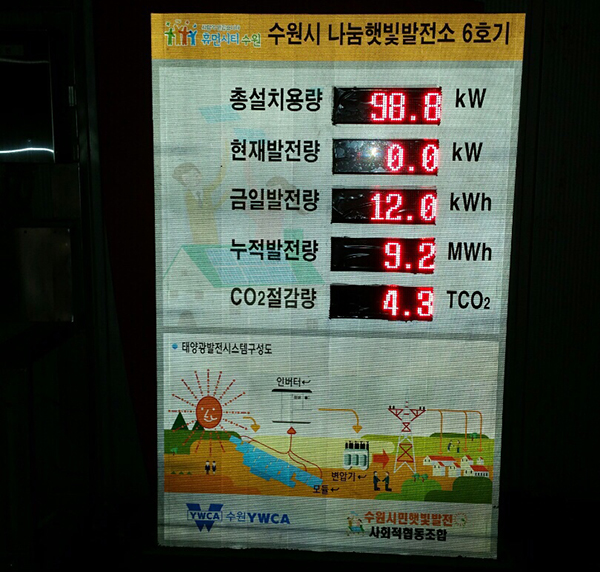 | 나눔햇빛발전소 6호기의 발전량을 보여주는 모니터링 현황판 [사진=수원시청] |