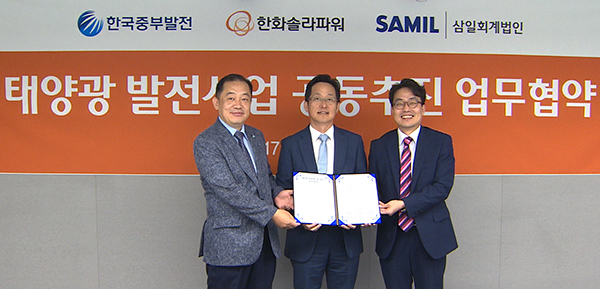 [Industry News 최홍식 기자] 한국중부발전과 한화솔라파워, 삼일회계법인이 9월 5일 에너지전환 정책에 적극 부응하고, 신재생에너지 발전량 목표 상향조정에 선제적으로 대응하기 위한 '태양광발전 사업 공동추진 업무협약'을 체결했다.