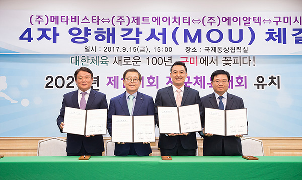 구미시는 지난 9월15일 차세대 에너지 시장 선점을 위해 민·군 겸용 액화수소연료전지 드론 개발을 위한 4자간 협약을 국제통상협력실에서 체결했다. 협약에는 메타비스타, 제트에이치티, 에이알텍이 참가했다.