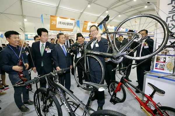 | 제12회 국제탄소페스티벌이 오는 11월 1일부터 서울 코엑스에서 개최될 예정이다. 사진은 지난 페스티벌에서 탄소소재로 만든 자전거를 들어올리는 송하진 도지사의 모습 [사진=전라북도 탄소산업과] |