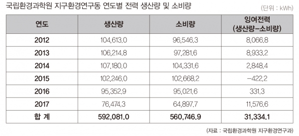 에너지 절감과 탄소배출 제로를 추진하고 있는 국립환경과학원 지구환경연구동은 2012년 완공 이후 올해까지 총 592,081.0kWh의 전력을 생산했다. 그 동안 생산된 전력에서 사용한 총 전력을 빼면 잉여전력을 도출할 수 있다. 지금까지 지구환경연구동의 잉여전력은 약 31.334kWh로 이는 산업통상자원부 기준에 따라 4인 기준 1,000가구가 한 달간 사용가능한 전력량이다. 산업통상자원부에 따르면 4인 가구의 한 달 전력사용량은 약 350kWh다. 지구환경연구동의 잉여전력은 국립환경과학원 내 다른 건물로 전송되어 활용되고 있다.