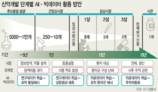 통상 글로벌 신약 하나를 개발하기 위해선 10∼15년의 오랜 시간과 1조원 이상의 막대한 비용을 투자해야 한다. 또 성공확률도 매우 낮아 그동안 국내 기업이 글로벌 시장에 진출하는 데 높은 진입 장벽으로 작용해왔다. 최근 이런 한계를 극복하기 위한 대안으로 빅데이터와 AI를 활용해 신약개발에 필요한 비용과 기간을 줄이는 방안이 제시되고 있다.