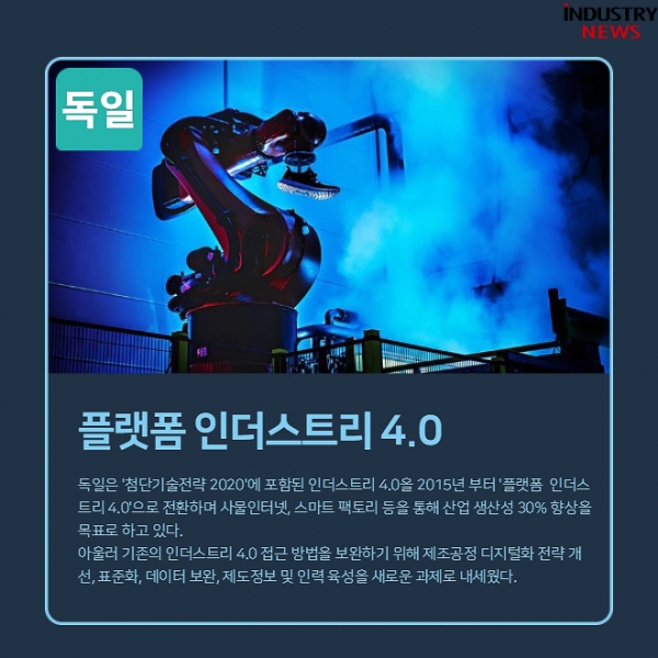 [Industry News 박규찬 기자] 독일은 '첨단기술전략 2020'에 포함된 인더스트리 4.0을 2015년 부터 '플랫폼 인더스트리 4.0'으로 전환하며 사물인터넷, 스마트 팩토리 등을 통해 산업 생산성 30% 향상을 목표로 하고 있다. 아울러 기존의 인더스트리 4.0 접근 방법을 보완하기 위해 제조공정 디지털화 전략 개선, 표준화, 데이터 보완, 제도정보 및 인력 육성을 새로운 과제로 내세웠다.