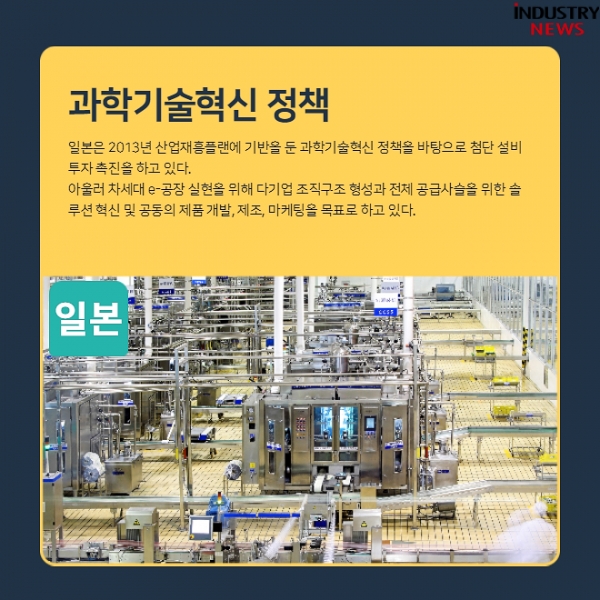 일본은 2013년 산업재흥플랜에 기반을 둔 과학기술혁신 정책을 바탕으로 첨단 설비투자 촉진과 과학기술혁신 정책을 펼치고 있다. 아울러 차세대 e-공장 실현을 위해 다기업 조직구조 형성과 전체 공급사슬을 위한 솔루션 혁신 및 공동의 제품 개발, 제조, 마케팅을 목표로 하고 있다.