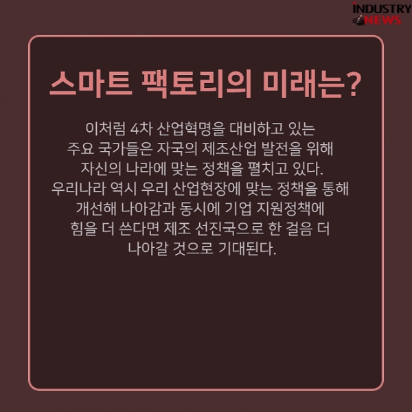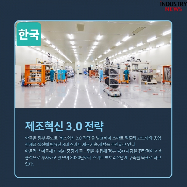 한국은 정부 주도로 '제조혁신 3.0 전략'을 발표하며 스마트팩토리 고도화와 융합신제품 생산에 필요한 8대 스마트 제조기술 개발을 추진하고 있다. 아울러 스마트제조 R&D 중장기 로드맵을 수립해 정부 R&D 자금을 전략적이고 효율적으로 투자하고 있다. 또한 민관합동 스마트공장추진단을 설립해 오는 2020년까지 스마트 팩토리 2만개 구축을 목표로 하고 있다.