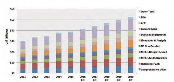 시장조사기관인 심데이터는 특히 PLM 시장이 연평균 6.3% 성장해 2020년에는 523억 달러 규모에 이를 것으로 전망했다. 2015년 전세계 PLM 시장 규모는 387억 달러로, 전년도 대비 2.8% 성장한 것으로 나타났다. 주요 PLM 선두 업체들이 전반적으로 꾸준한 성장을 거둔 가운데 포트폴리오를 확장하기 위한 전략적 인수를 이어가고 있다.