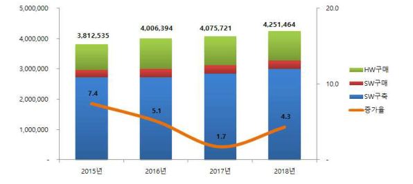 SW구축 사업은 전년대비 1,461억원(5.1%) 증가하였으며, 운영 및 유지관리 사업이 1조 7,549억원(전년대비 804억원, 4.8%증가), SW개발사업이 8,917억원(전년대비 1,270억원, 16.6%증가)으로 나타났다.