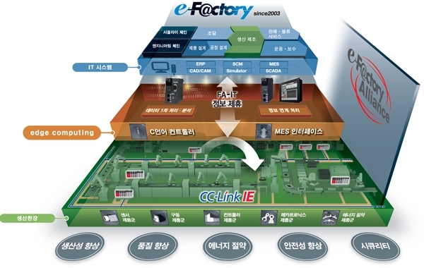[인더스트리뉴스 방제일 기자] 한국미쓰비시전기오토메이션(대표 김형묵)의 e-F@ctory는 생산성과 품질, 환경성과 안정성 나아가 보안 향상을 실현해 기업의 TCO 삭감과 기업가치 향상을 지원한다. 또한 T 시스템에 의한 분석 및 해석결과를 생산현장에 즉시 피드백하고 개선하며 A에서 수집한 데이터를 엣지 컴퓨팅에서 먼저 처리해 IT시스템을 가시화하고 기업가치 향상을 지원한다. 나아가 한국미쓰비시전기오토메이션은 최근 e-F@ctory 얼라이언스를 발족하며 미쓰비시 FA기기와 접속 친환성이 높은 소프트웨어 및 하드웨어 파트너사와 강력한 연계를 통해 고객에게 최적의 솔루션을 제공하려 노력하고 있다.