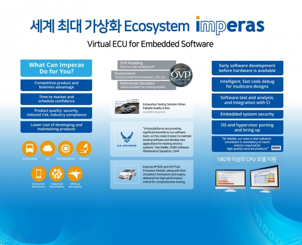 가상 머신 기반의 임베디드 소프트웨어 개발 검증 솔루션인 ‘임페라스’는 하드웨어 장비 개발 전에 소프트웨어 개발이 가능해 개발 시간에 소요되는 시간을 기존 대비 수십 배 이상 단축시킬 수 있으며, 간편하게 CPU를 재구성할 수 있어 설계 및 개발, 테스트 비용을 줄일 수 있다.
