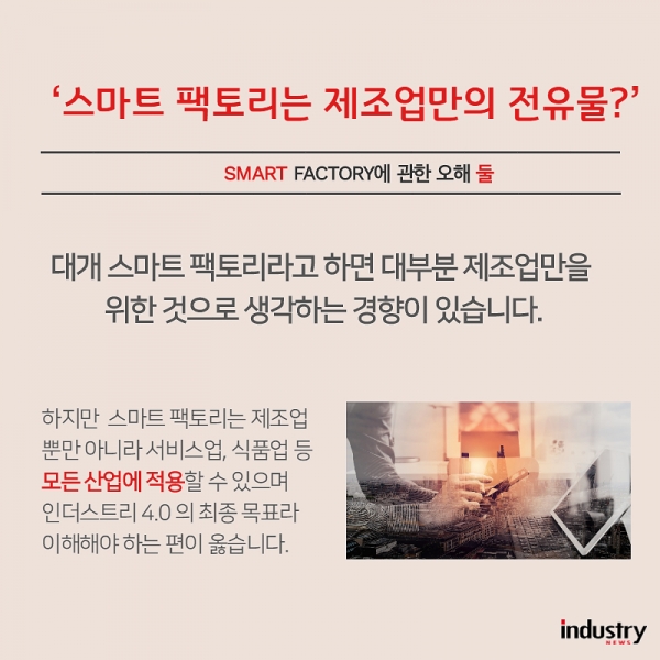 또한 스마트 팩토리는 제조업만의 전유물이 아닌 서비스업, 식품업 등 모든 산업에 적용할 수 있으며 인더스트리 4.0의 최종 목표라고 이해하는 편이 옳다.